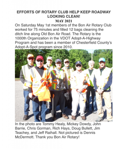 Recently the Rotary Club of Newport News members were honored to have the recipients of their club’s charitable donations attend and provide lightning-quick talks on their organizations including An Achievable Dream, Fear 2 Freedom, Virginia Center for Inclusive Communities, N.N. Public Art Foundation, Port Warwick Foundation, Startwheel, Faith Recovery, Soundscapes and Thrive! South Hill Club:  The South Hill Rotary Club and The South Hill Lions Club teamed up this year for the Highway Cleanup Project on their adopted highway section from Farrar Funeral Home to the interstate near Loves. The Rotary Club does this during the year in an effort to keep the town looking its best for visitors. The Lions Club joined in to help to do their part for their environmental efforts. Photo by Lisa ClaryAND…  The South Hill Rotary Club presented $1000 scholarships to six Park View High School students this year as they pursue their college goals. Pictured: Rotary Members Lisa Clary, Randy Cash, students Mark Arrington II, Luke Richey, Kaitlyn Campbell, Mackenzie Bowen, Joshua Lipscomb, Ella Patton, Club Vice President Lynn Ellis and Club President Keith Ellis.AND…  Kenston Forest School seniors, Austin Dornak and Ariana Mannino are the recipients of the South Hill Rotary Dr. Thomas and Ann Fitzgerald $1,000 Scholarship. Mr. Keith Ellis, South Hill Rotary President, presented the certificates to Miss Dornak and Miss Mannino, at Kenston Forest School. The Rotary Club will send the $1,000 scholarships to the University of Texas at Austin, where Miss Dornak plans to attend in the fall and Virginia Commonwealth University, where Miss Mannino will attend in the fall. Picture 0574 Miss Dornak is the daughter of LJ and Kim Dornak of South Hill. Picture 0581 Miss Mannino is the daughter of Cesare and Mary Ellen Mannino of South Hill. Pictured are the young ladies with Club President Keith Ellis and Vice President Lynn Ellis. AND…  The South Hill Rotary Club made a donation of baby items from members of the club to The Selah Center in Clarksville last week. Ruth McDonald, Exec. Director of the Selah Center accepted the donations. The Selah Center’s purpose is “Helping Pregnant Women Make Choices That Will Save Lifetimes” for both the child and the parent(s). Through their Earn While You Learn curriculum, they offer both hope and help to those who need it most. It has led to many lives being saved and for those who chose life for their babies to learn, grow, and understand how to be good mothers to their children. By attending incentive classes they earn Boutique Bucks that may be redeemed at their boutique for diapers, wipes, children’s clothing, and other essential items for life with little ones. For more in information or to make a donation contact 434-362-2207. Pictured: Charles Wright, Lynn Ellis, Ruth McDonald, Keith Ellis, Lisa Clary and Jimmie Keith Crowder. Huguenot Trail Club: First Responder's Day - April 2021 Recently the club hosted Chesterfield County Sheriff's Office Employee of the Year, Sgt. E. Magg, along with his colleagues, First Lt. L.A. Ford, and Lt. M. Franz. Sgt. E. Magg held three different assignments over the course of 2020 and was recently awarded a well-deserved promotion. Chesterfield County Sheriff's Department currently has about 230 employees and they manage around 1000 inmates throughout the County. AND…  Thanks to everyone's support and help with the golfing event last month, we were able to present James Howard with a check for VAU Veterans and Athletes United. In addition to VAU, James is the President & Founder of REACHcycles - Richmond Empowering Abilities for CHildren with Cycles . This is a non-profit that provides mobility and independence to children and Veterans with disabilities through adapted cycles. He anticipates hosting another bike building event in July 2021--- details to come! James City County Satellite Club: