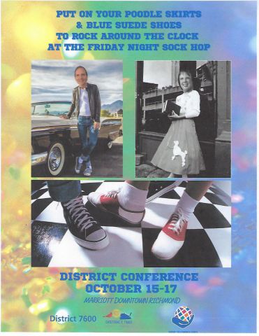 Rotary District 7600 has a new Administrative Assistant . . . Phyllis Mayfield. Phyllis, a native of Newport News, VA served as the Rotary District 7600 Secretary from 2010-2012. She left the role in 2012 to move to Florida to be near her grandkids. She recently relocated back to Virginia (the place she considers home) and began another chapter with Rotary District 7600 in May. Phyllis enjoys gardening, baking, painting (landscapes and wine glasses), reading, spending time with her friends and family and just enjoying life in her spare time. Phyllis says she considers herself blessed to have the opportunity to work with the District and all of it’s wonderful members again. Welcome Back, Phyllis! District Conference News: submitted by Pat Edwards & Colleen Bonadonna, District Conference Chairs SAVE THE DATE: One of the exciting and most rewarding events during any Rotary year is the District Conference which will be held this year on October 15-17 th at the Richmond Downtown Marriott. Early bird registration will begin on July 10 th. Several great speakers are lined up to address all the areas of focus, and there will be service projects, a sock hop, an international evening with Rotary Family Feud and much, much more. Here’s how clubs can be involved: