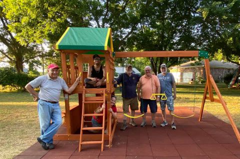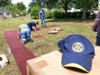 Club members gathered together in an effort to assemble a swing set, but there were no instructions included and the internet was no help. Initially they were only able to get the rubber mats down. Then after three hot days and 68 pages of instructions they finished the play set for a local group. Thanks to the members who came out to work on this project - especially Aaron & Dan, who are not club members and members Tony & Cabell who worked all 3 days.  AND  Congratulations to New Kent High School seniors who are recipients of the Rotary Club of New Kent Scholarships. President Brent Bohannon spoke to them on living by the 4-way test. Newport News Club: