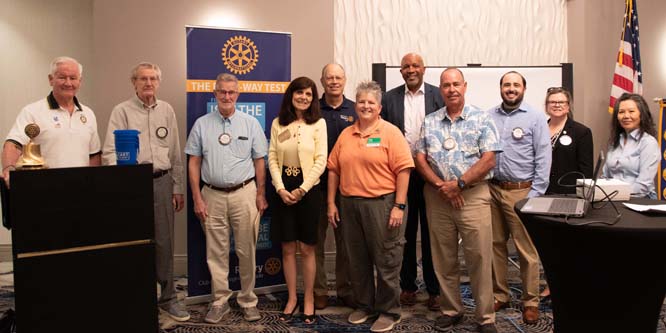 October 13th through 15th saw the 2023 District Conference of our District 7600. The venue was the nearby Newport News Marriott at City Center. Our own PDG Diane Hagemann was the co-chair of the conference and played a central role in the organization and running of the event. Ray Spencer, with help from Kevin Yeargin, presented the club's recently-completed Global Grant at two different breakout sessions. And half of the Sergeant-at-Arms crew was from the Peninsula Club. Shown in the Sergeant-at-Arms photo above are (left to right) Kevin Yeargin of the Peninsula Club, Mike Jallo of the Historic Triangle Club, John Frantz of the Peninsula Club, Joe Hansley of the Churchland Club, Ron Lynde of the James City County Club, and Bill Ziglar of the Peninsula Club.